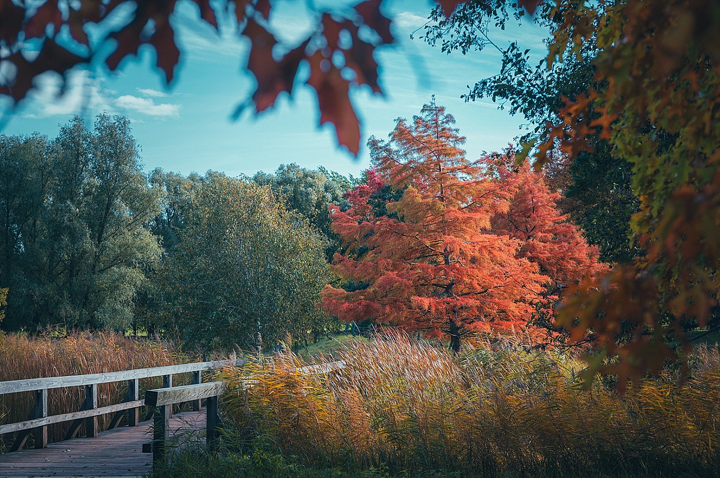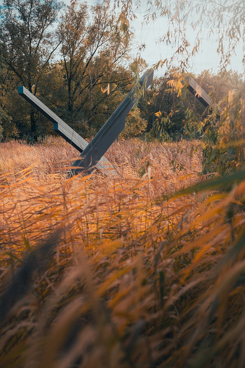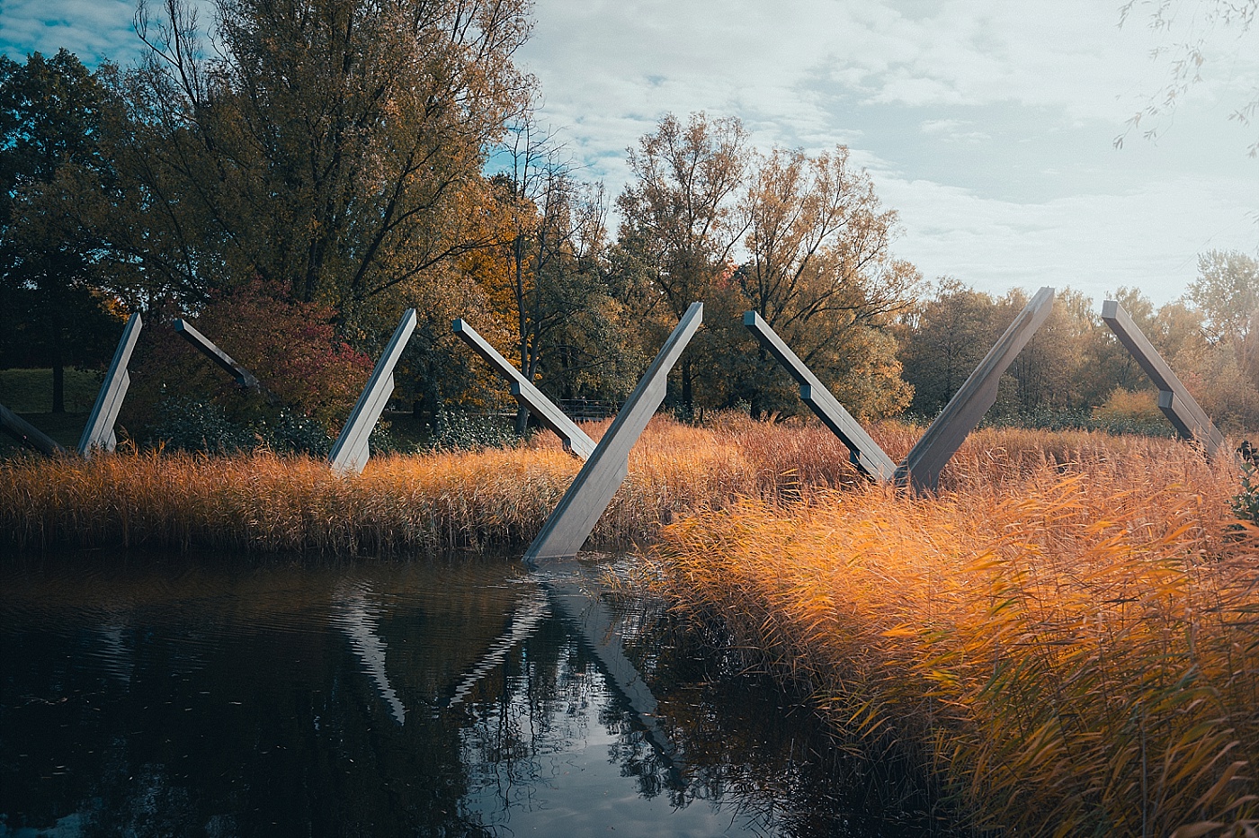 Der Herbst hat den Garten in warmes Licht getaucht. Kräftige Rottöne, goldene Blätter und ein helles Blau im Wasser. Zwischen den herbstlichen Szenen ragen kantige, etwas martialisch aussehende Metallstrukturen aus dem Wasser. Das sind die Träger der großen Sonnenuhr, einem der bekanntesten Kunstwerke im Britzer Garten. Sie verbindet Kunst, Natur und Wissenschaft. Die Konstruktion symbolisiert den Lauf der Sonne und zeigt die Zeit durch den Schattenwurf.